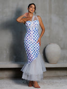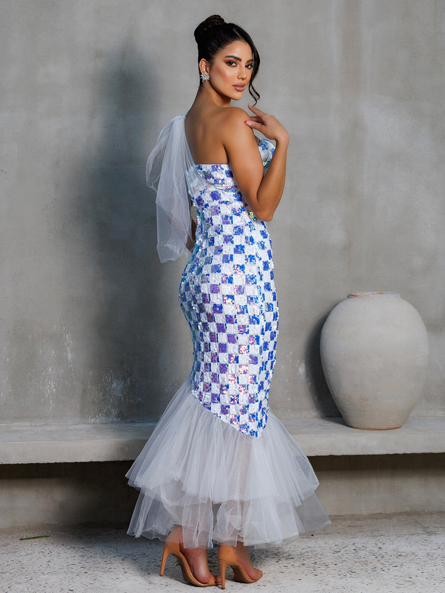 Prepare-se para chamar a atenção com nosso vestido de baile de lantejoulas com painel de um ombro e nó no laço! Esse vestido apresenta um divertido nó de laço no ombro e um painel de lantejoulas brilhantes. Perfeito para o baile de formatura ou qualquer ocasião especial, ele certamente fará você se destacar com estilo.
