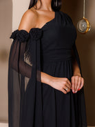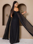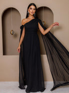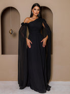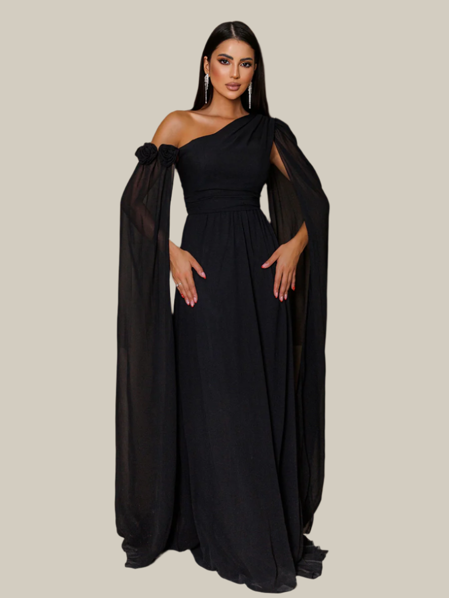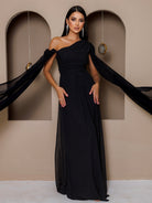 Esse vestido de baile preto de chiffon apresenta elegantes mangas drapeadas e uma lisonjeira silhueta em A. Seu design exclusivo de um ombro só e apliques delicados dão um toque de sofisticação, perfeito para o baile de formatura ou qualquer ocasião especial. Confeccionado com chiffon de alta qualidade, esse vestido garantirá conforto e estilo a noite toda.