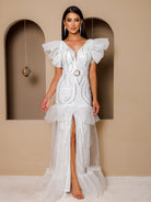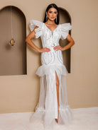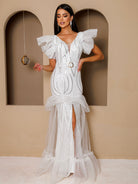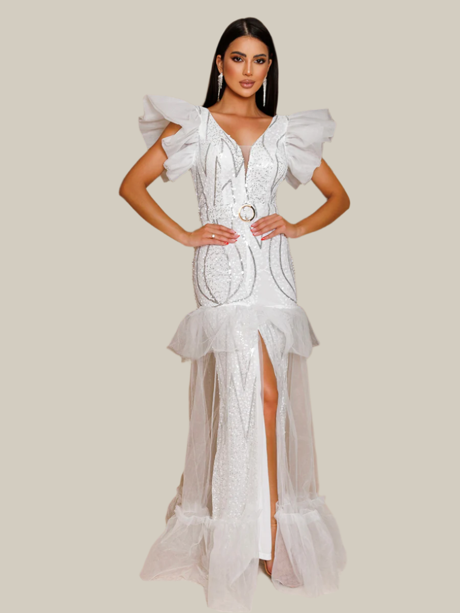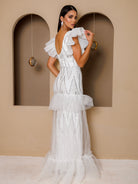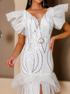 Este vestido fará com que você se destaque (no bom sentido)! Com mangas curtas divertidas e um design com várias bainhas, esse vestido de lantejoulas é perfeito para qualquer festa. Prepare-se para chamar a atenção e se divertir muito!