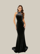 Vestido de noite formal de veludo preto com decote haltere e ombros frios RH30758