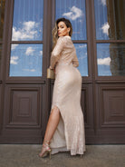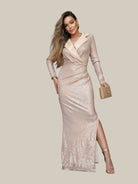 Esse vestido de baile formal de lantejoulas com fenda alta em damasco é perfeito para fazer uma declaração no baile ou em qualquer evento formal. O design de manga longa acrescenta um toque de elegância e a fenda alta permite fácil movimentação e uma silhueta lisonjeira. Feito com materiais de alta qualidade, esse vestido certamente impressionará.