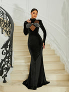 Este clássico vestido de noite de veludo preto é elegante e atemporal. Com um design feminino de decote alto e recorte, ele combina luxo e sofisticação para um visual atemporal que é perfeito para ocasiões especiais. O tecido de veludo deslumbrante cai lindamente sobre o corpo, proporcionando uma silhueta incrivelmente chique.