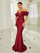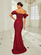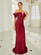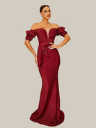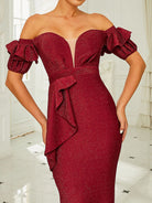 Esse vestido de baile Borgonha com babados e glitter sem ombros é perfeito para fazer uma declaração ousada. Com suas mangas curtas, silhueta sereia e decote em V, ele destaca a forma feminina, mantendo-se elegante e atemporal. Prepare-se para brilhar na pista de dança!