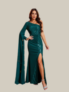 Esse vestido de baile com um ombro só e fenda alta é feito de lantejoulas verdes exuberantes, que farão você se destacar em qualquer evento. Prepare-se para deslumbrar com um visual elegante e atemporal que certamente chamará a atenção.