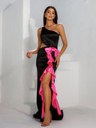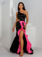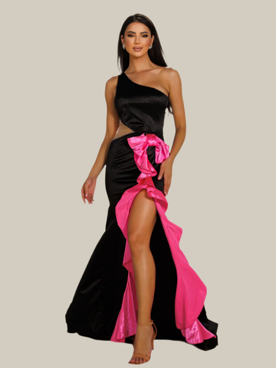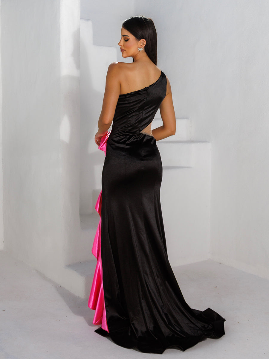Vestido de cetim com um ombro só e fenda com babados DH80001