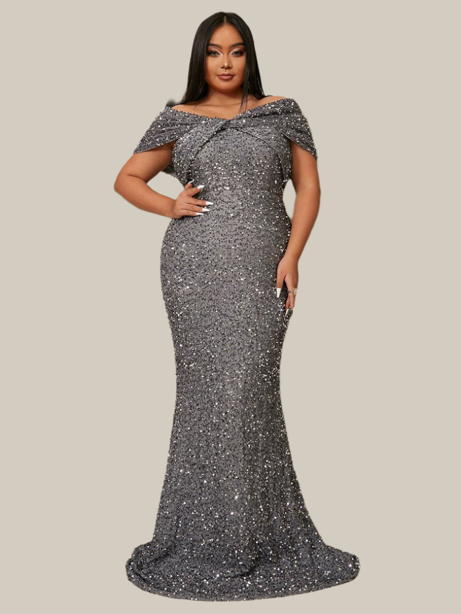 Vestido de noite sereia com lantejoulas e ombros de fora plus size PWY108