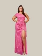 Esse vestido de baile Plus Size One Shoulder Backless Split Pleated Off Shoulder apresenta uma silhueta exclusiva de um ombro só, perfeita para fazer uma declaração. Seu intrincado plissado e design dividido criam um visual atraente para sua próxima ocasião especial.