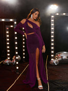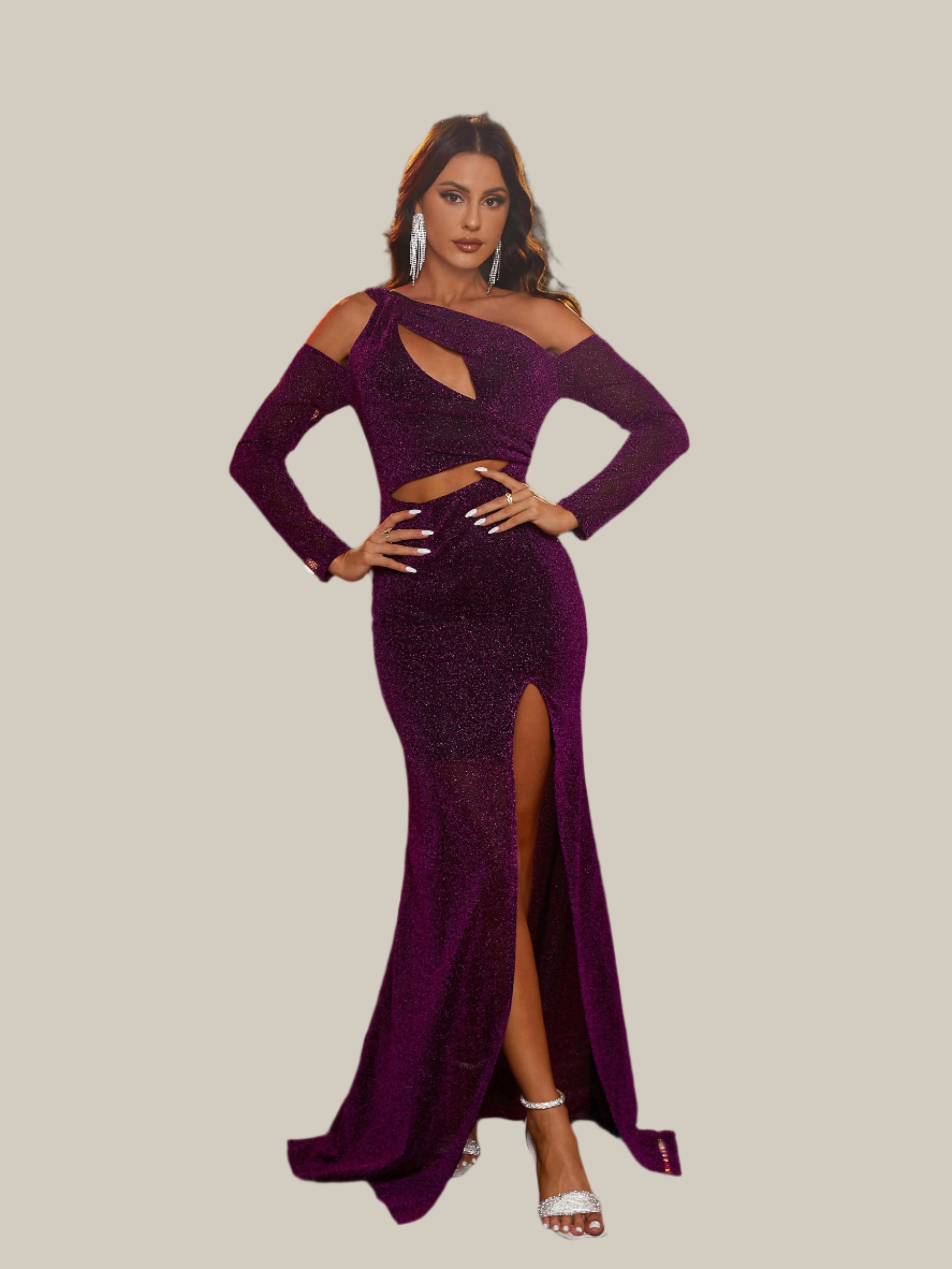 Dê um ar glamoroso à sua próxima ocasião especial com este Sexy One Shoulder Cut Out Giltter Purple Prom Dress! Confeccionado em spandex, este estilo chique apresenta uma alça de um ombro e tecido brilhante que a fará sobressair da multidão. Perfeito para casamentos, jantares e outros eventos formais.