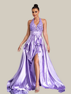 Vestido de cetim com fenda alta e drapeado sem mangas DH80080
