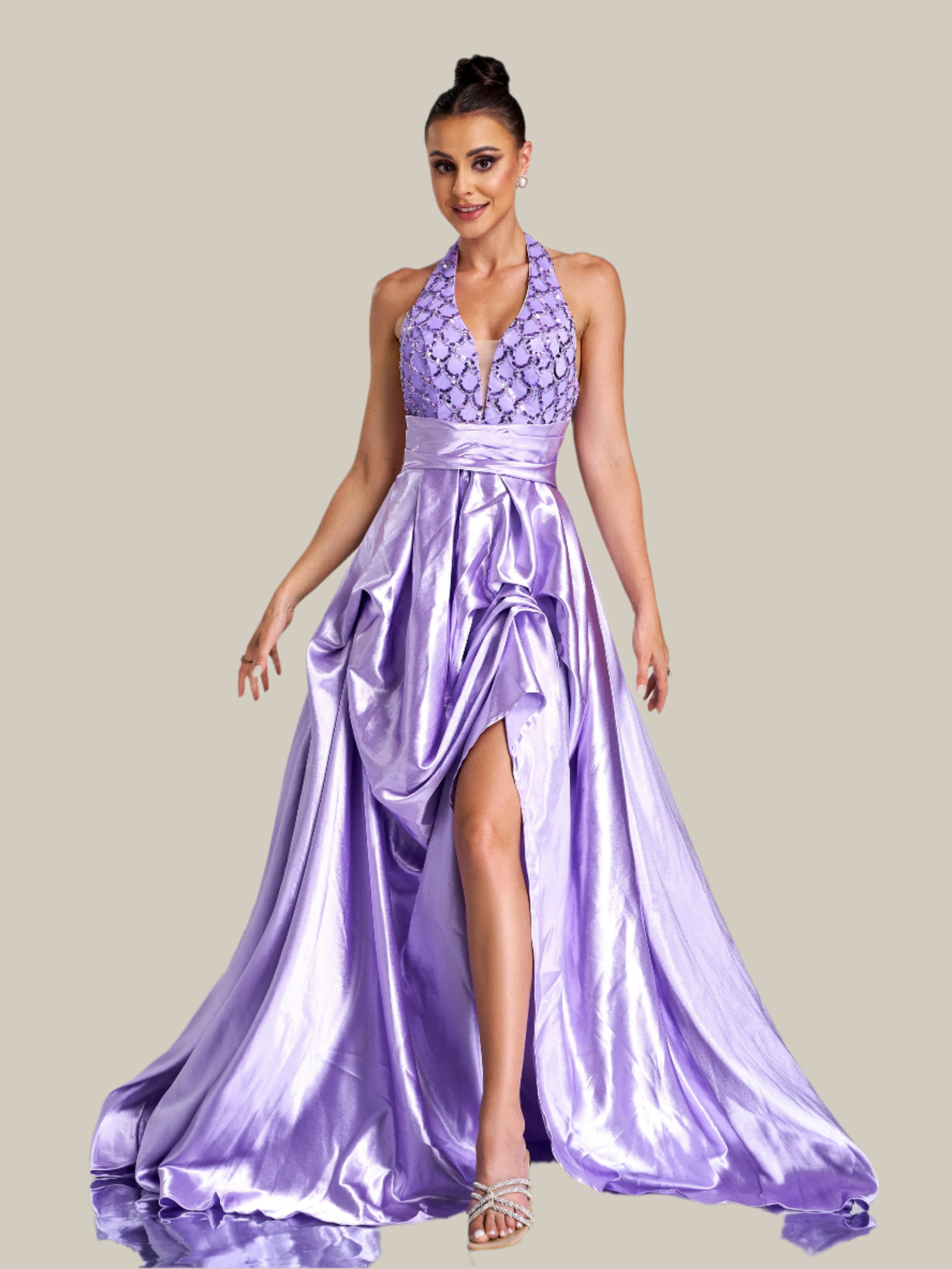 Este deslumbrante vestido de cetim com fenda alta e drapeado sem mangas oferece um estilo moderno e elegante, perfeito para qualquer ocasião especial. O design sem mangas e a fenda alta adicionam um toque de sofisticação, enquanto o tecido de cetim cria um visual luxuoso e atraente. Eleve seu guarda-roupa com esta peça essencial!