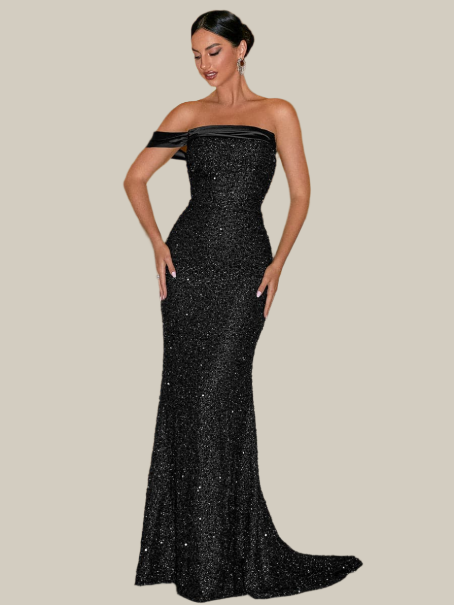 Este elegante e estiloso vestido de noite preto sereia sem alças ostenta sua silhueta e oferece um visual atemporal. Usando uma silhueta justa e um design sem alças, você pode ter certeza de fazer uma declaração elegante e realçar seu charme natural.