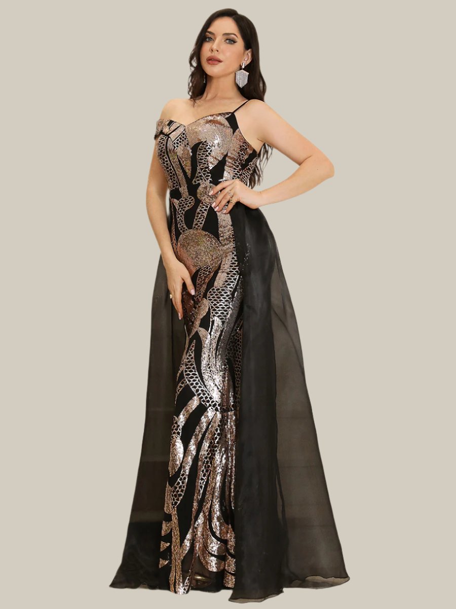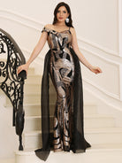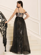 Faça uma entrada atemporal e sofisticada com esse vestido formal com decote em coração e lantejoulas contrastantes. Apresenta um adorável decote em coração, corpo de lantejoulas contrastantes e saia drapeada de malha. Essa peça elegante tem acabamento em preto e apresenta design sem mangas e sem costas. Perfeito para qualquer evento formal.
