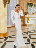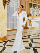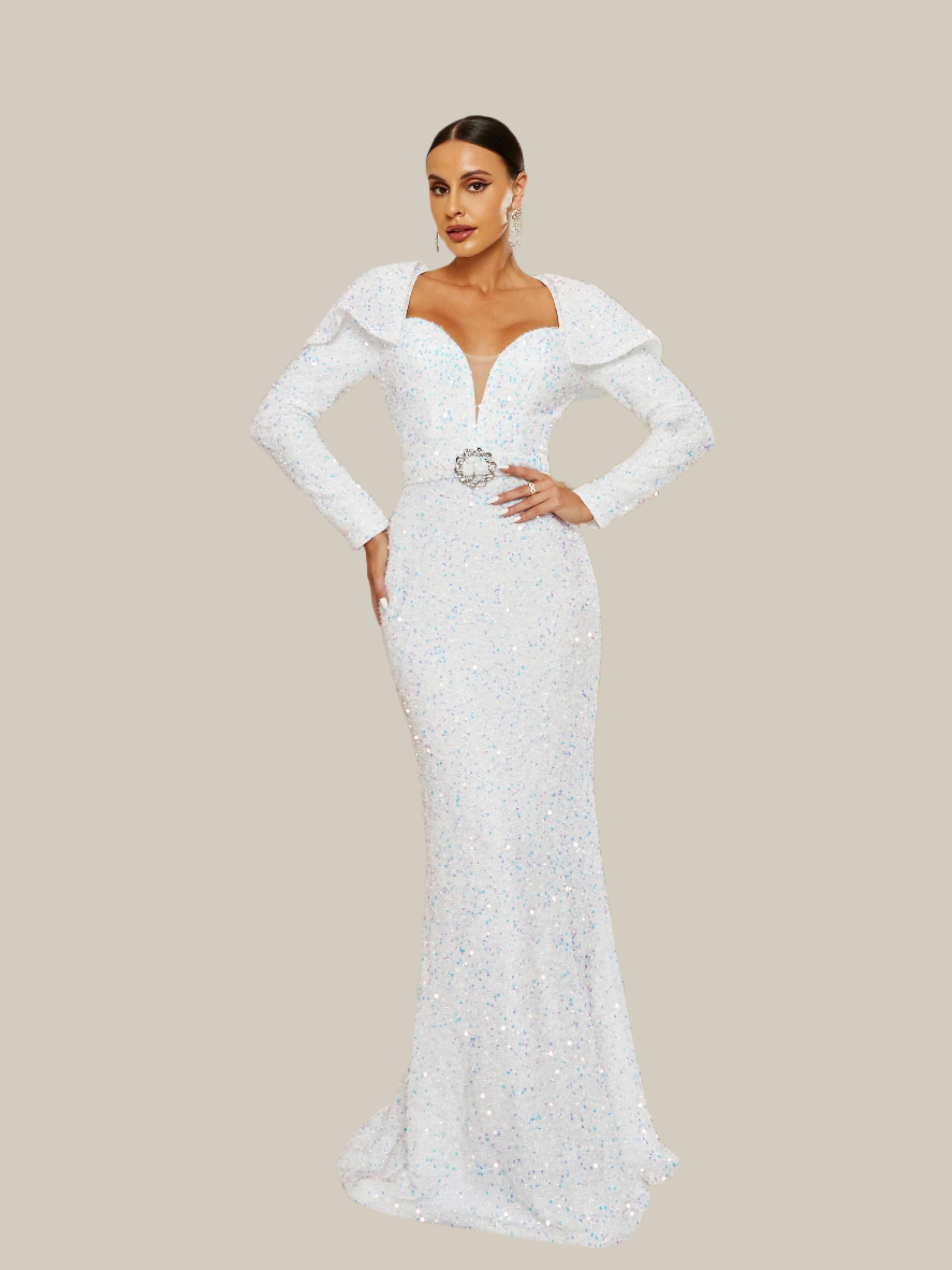 Fique elegante e sofisticado com esse lindo vestido de noiva branco com decote em coração e manga longa de lantejoulas. As lantejoulas delicadas e a silhueta justa criam uma silhueta impressionante para qualquer ocasião de casamento. Perfeito para um visual clássico e atemporal.