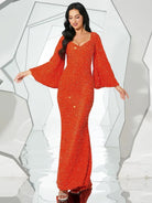 Vire as atenções com este vestido maxi que pára o espetáculo! Com as suas mangas em sino, decote em V e lantejoulas brilhantes, é a forma perfeita de entrar em qualquer evento. Comece a festa com este deslumbrante número que a fará sentir-se como uma verdadeira rainha-sereia!