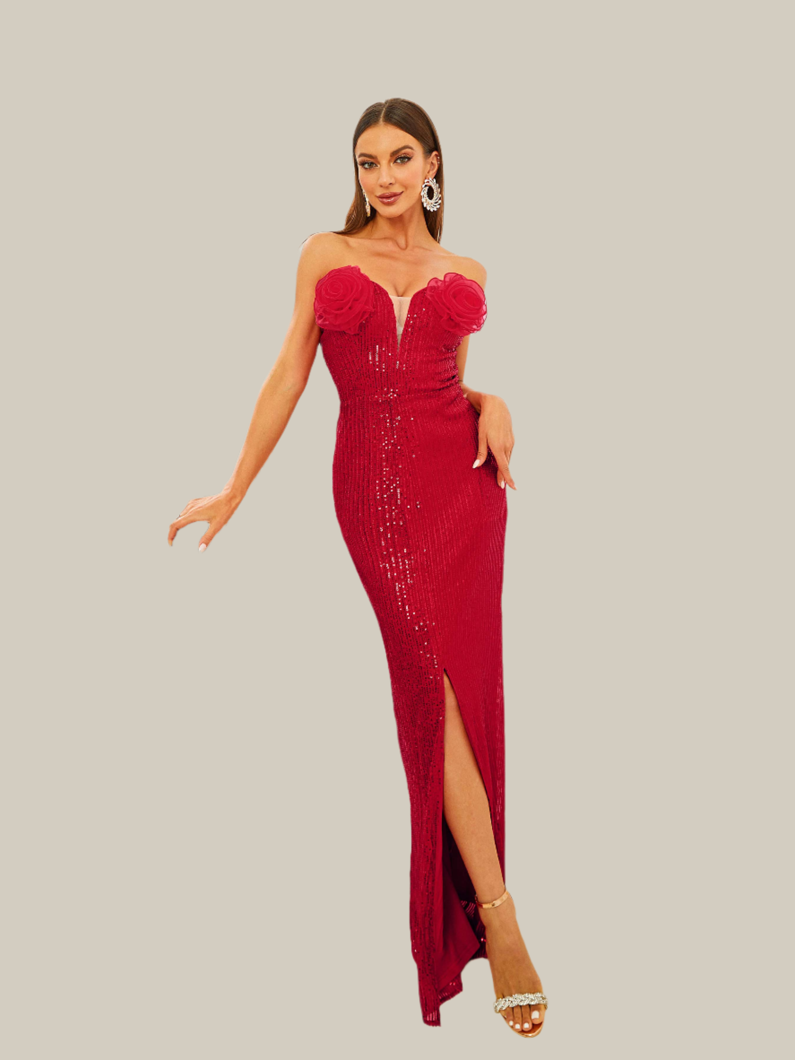 Fique deslumbrante com esse vestido de baile vermelho de lantejoulas divididas. Sua parte superior tubular é coberta com um aplique de padrão floral, fazendo com que você se destaque em qualquer evento. Mostre sua personalidade e brilhe com esse vestido único e elegante.