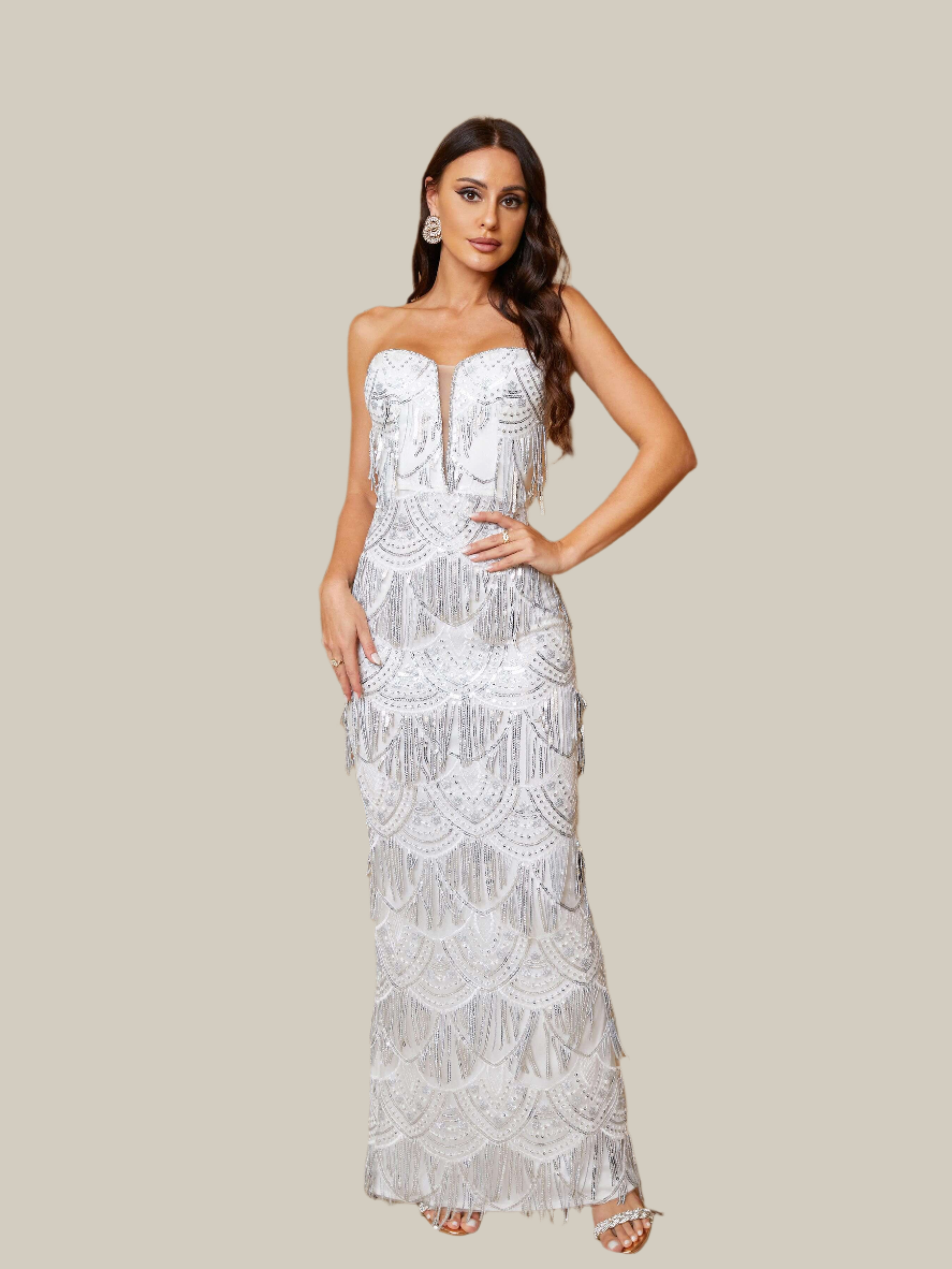Esse vestido de baile tubinho com franjas e lantejoulas, estilo RJ10826, é a escolha perfeita para qualquer ocasião especial. Com um design exclusivo de fenda e detalhes brilhantes de lantejoulas, esse vestido com certeza fará você se destacar. A parte superior tubular proporciona um ajuste lisonjeiro e confortável, enquanto a franja acrescenta um toque de diversão e movimento. Sinta-se confiante e glamourosa com esse vestido de baile único.