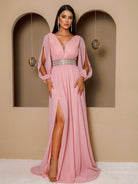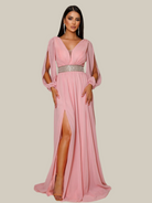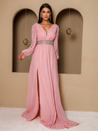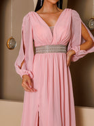 - Detalhes: Tule, decote em V, recorte, cinto, fenda, rosa