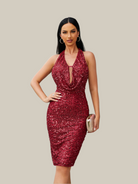 Este vestido de cocktail com decote em V e costas abertas, com pregas, dá-lhe o look clássico perfeito. Com um decote em V para mostrar a quantidade certa de pele e as pregas na saia, vai certamente chamar a atenção.