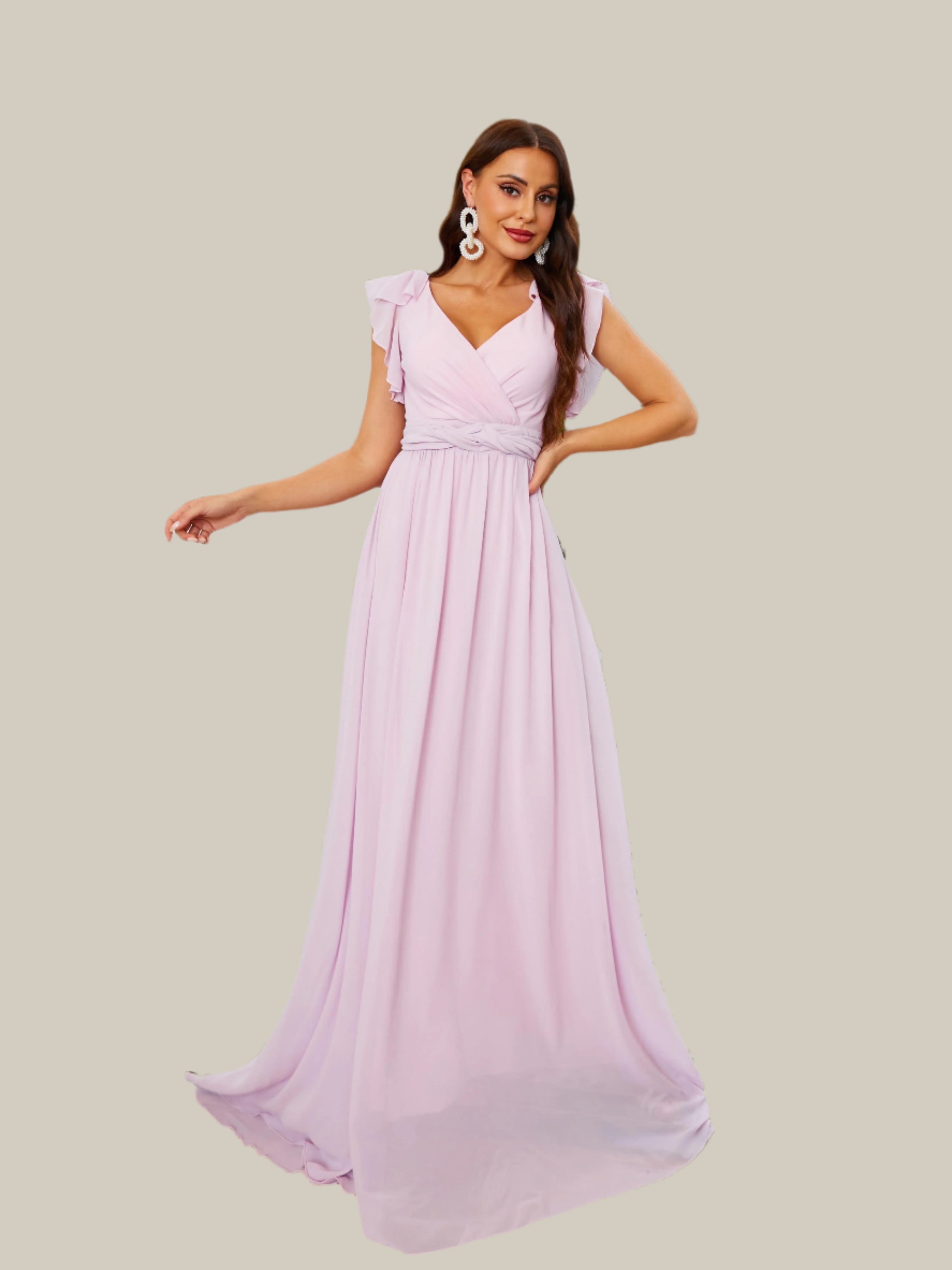 Experimente a elegância do vestido de dama de honra roxo com decote em V e sem mangas. Confeccionado com tecido luxuoso, esse vestido com certeza deixará sua festa de noiva deslumbrante. A adição perfeita para qualquer casamento, o decote em V e o design sem mangas impressionarão seus convidados.