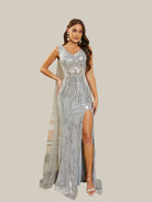 Dê o seu melhor em qualquer ocasião especial com esse elegante vestido de baile com decote em V, sem mangas, com lantejoulas e fita dividida prateada. Confeccionado em tecido de lantejoulas de alta qualidade, esse vestido chamativo apresenta uma confortável fita dividida e uma lisonjeira silhueta com decote em V. Perfeito para bailes de formatura, casamentos e outros eventos formais.