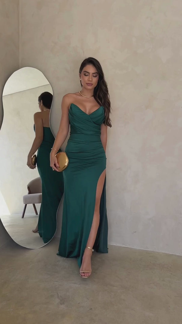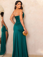 Detalhes: Sem alças, fendas, costas abertas, plissado