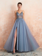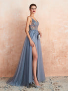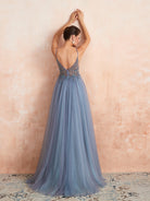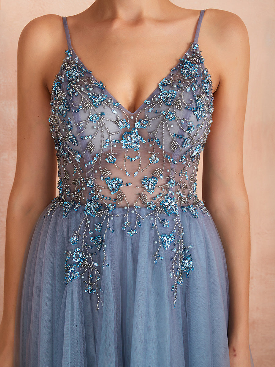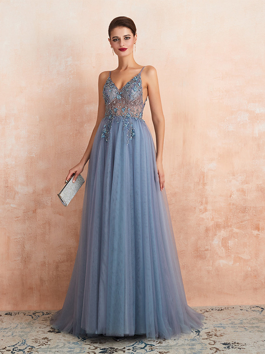 Vestido de noite sexy com alças finas e decote em V em tule MCB1028