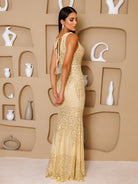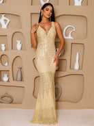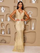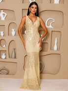 Seja o maior destaque em nosso vestido formal amarelo sereia com lantejoulas com decote em V! Com seus impressionantes detalhes em strass e o elegante corte sereia, esse vestido fará você brilhar como uma estrela. Seja a bela do baile e chame a atenção a cada passo.